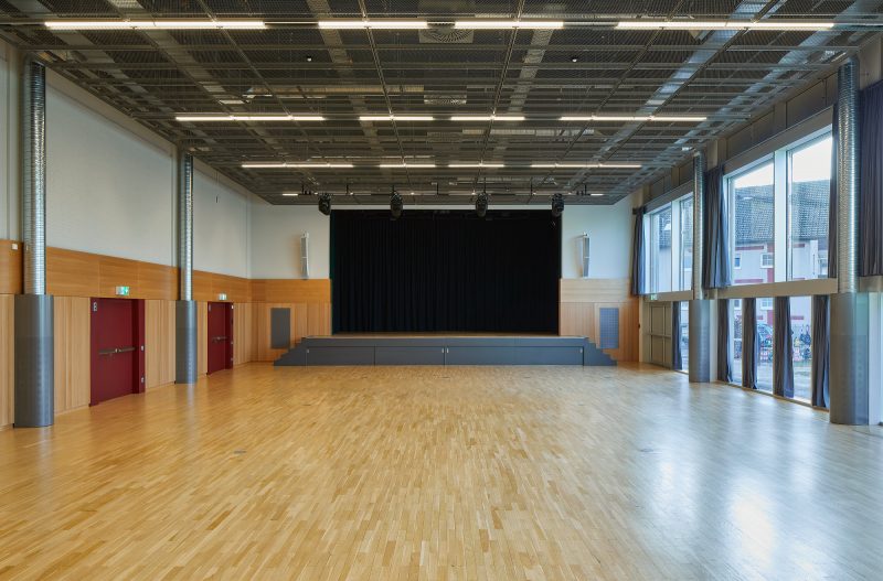 Die Mehrzweckhalle aus den 1960er-Jahren wurde umfassend modernisiert. Bestehende Strukturen wurden sorgfältig analysiert, neu geordnet und gezielt ergänzt. Die innere Organisation wurde klarer gefasst, barrierefreie Erschließungen integriert und die haustechnischen Anlagen vollständig erneuert. Neue Fassadenelemente und Fenster verbessern die energetische Qualität des Gebäudes, ohne seinen ursprünglichen Ausdruck zu verlieren.