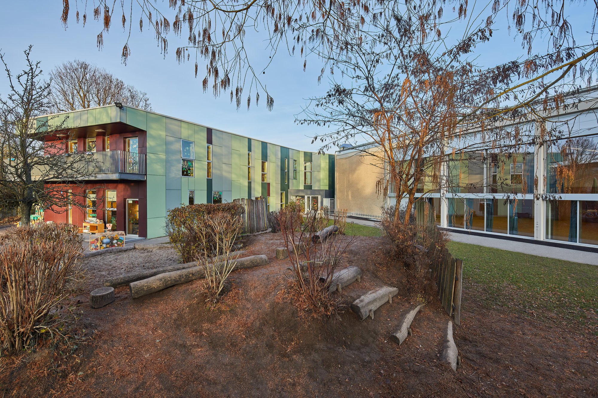 Das angrenzende Multifunktionsgebäude wurde funktional erweitert und architektonisch weiterentwickelt. Über dem Foyer der Mehrzweckhalle entstanden neue Räume für die Kinderbetreuung, ergänzt durch einen Holzbau-Anbau mit zusätzlichen Flächen. Vorhandene Fassadenelemente des Bestands wurden im Sinne des Re-Use-Gedankens wiederverwendet und in die neue Gebäudehülle integriert, wodurch Ressourcen geschont und der Zusammenhang von Alt und Neu gestärkt wird. Die enge bauliche Verknüpfung von Mehrzweckhalle und Multifunktionsgebäude ermöglicht eine flexible Nutzung durch Vereine, Verwaltung und Kinderbetreuung und schafft klare funktionale Synergien innerhalb des Ensembles.